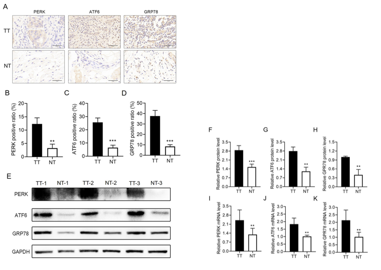 首先,作者进行了免疫组化检测和WB检测。实验结果证明,肿瘤组织中内质网应激相关marker-PERK/ATF6和GRP78的表达显著高于对照组,表明口腔鳞状细胞癌组织中内质网应激升高。